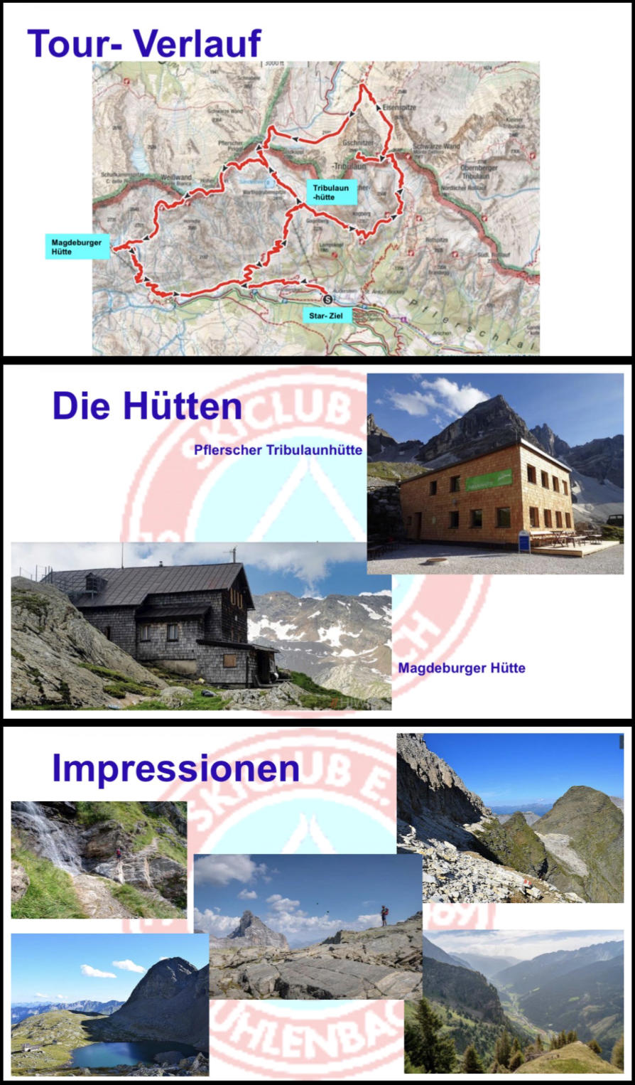 Tag 1 Start Parkplatz Feuerstein im Pferschtal (1255m). Aufstieg über den Wasserfallweg und Weg Nr. 8A zur Pflerscher Tribulaunhütte (2369m) Gehzeit 4:00h / 1120 Höhenmeter Tag 2 Mit frühem Start beginnt dieTagestour auf dem Pflerscher Höhenweg erst abwärts, anschließend hinauf zur Schneetalscharte (2642m). Dann je nach Situation Besteigung der Schwarzen Wand (2917m) oder dem Gschnitzer Tribulaun (2945m). Nun Abstieg zur Gschnitzer Tribulaunhütte (2064m). Anschließend geht es hinauf zum Sandesjöchl (2599m) und auf dem folgenden Abstieg zurück zur Hütte. Gehzeit ca. 8:15 h / 1500 Höhenmeter / 1500 m Abstieg Tag 3 Aufstieg und Besteigung des Hohen Zahn (2924m). Dann weiter auf dem Tiroler Höhenweg und Besteigung der Weißwand (3016m). Anschließend Abstieg zum Rochollsee und weiter zur Magdeburger Hütte (2423m). Gehzeit ca. 5:00 h / 800 Höhenmeter / 750 m Abstieg Tag 4 Abstieg zur Furtalm (1690m) und weiter zum Parkplatz. Gehzeit ca. 3:30 h / 90 Höhenmeter / 1170 m Abstieg Zusätzlich möglich: ggf. Sonntag früh morgens Besteigung der Schneespitze (3178m), 750hm Gehzeit- Angaben sind ohne Pausen!